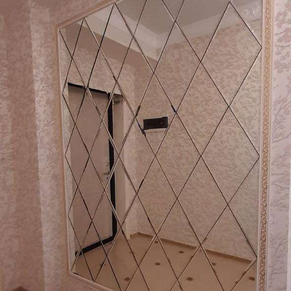 Использована зеркальная серебряная плитка квадратной формы, размером 18х18.
